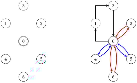 An example of PDSTSP is provided on the left; we assume that two drones are available (travel times are omitted for the sake of simplicity). A solution is provided on the right. The black arcs represent the tour of the truck that visits nodes 1 and 3 before going back to the depot. The red arcs depict the missions of the first drone (that serves nodes 2 and 6), while the blue arcs depict the missions of the first drone (that serves nodes 4 and 5).