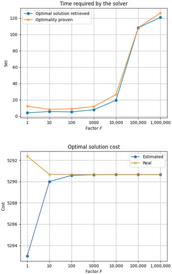 We carried out a preliminary study to identify a suitable value for the factor F that would then be adopted for the rest of the experiments. A representative instance to illustrate our results was identified in berlin52_0_80_2_2_1 (originally proposed in [] and with an optimal solution of cost 5290.652). The results obtained by considering are reported in Figure 2. In the first chart, we report the computation time (in seconds) required by the solver for different values of F; in the second chart, the value of the optimal cost affected by precision errors (estimated), and the value of the real cost of the same solution, are plotted.
