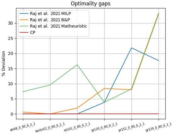 In Figure 4 the optimality gaps are reported for all the methods available for these instances. For each method M, the gap is calculated in terms of the percentage deviation from the optimal solution as , where is the cost of the best solution retrieved by method M. From the chart, it is possible to see how the methods previously introduced in [] have difficulty finding high quality solutions for the larger instances, with substantial gaps with respect to CP in some cases. From the results on these instances, the best method among those discussed in [] appears to be the MILP-based method, although it performed poorly on one of the instances.