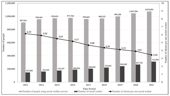 Social welfare is a service for people who need help in regards of welfare, health, medical treatment, education, and living to ensure people’s humane life [1]. A social worker is a one who provides these crucial services. Social workers require a high level of personal commitment compared to other professions to provide services, so the working conditions and the environments are the factors that directly affect the service quality [2]. Therefore, an improvement of these factors leads to satisfactory services [3]. The Korean Ministry of Health and Welfare has annually revised and promulgated the implementing rules that limit the number of clients that are handled by one welfare worker to 2.5 to maintain the quality of the services [4]. However, Figure 1 illustrates that the number of the elderly and disabled residents that are allocated to one social worker in Korea is still too excessive compared with the standard, even though the number of residents that are allocated to each social worker in Korea continues to decrease. This implies that an excessive amount of work is still distributed to one social worker in Korea. In addition, social workers in Korea have low salaries and unstable hiring systems, so their working environmental level and job satisfaction level are very low. According to a survey that was conducted by the Korean Ministry of Health and Welfare in 2011 [5], it was shown that 2479 social workers had job satisfaction levels that ranged from 2.38 to 3.51 out of 5 points. It was regarded as a low level of job satisfaction. To improve social workers’ job satisfaction, the Korean government has continuously legislated a law for increasing their treatment and dignity since 2012 [6].