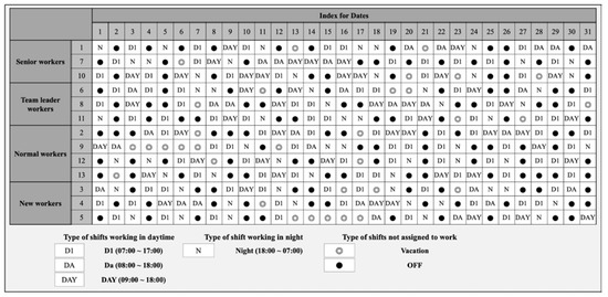 CPLEX version 12.10 was adopted to find an appropriate staff schedule that can maximize the sum of the workers’ satisfaction via the proposed mathematical model. The number of decision variable, is 31 × 13 × 5 = 2015 and various constraints should be considered, so it is difficult to find an optimal or near-optimal solution via heuristic approaches. Obtaining feasible solutions that reflect all the required schedule conditions that are based on penalty-function-based improvement algorithms is challenging even with metaheuristics, such as genetic algorithms, tabu search, and simulation annealing. Therefore, the mathematical model is developed as a form of integer programming to adopt CPLEX in this study, and an optimal staff schedule for the facility can be generated.
