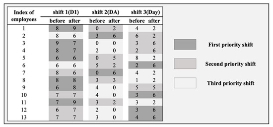 The average is very low in the case of the third preferred shift in the new schedule, which is 1.69, but it widely ranges from 0 to 6. This means there are some cases away from the average, in which most of the values are 0 or 2. According to the rules of the welfare facility, shift D1 needs 3 workers, shift DA needs 0 to 1 worker, and shift DAY needs 1 to 4 workers. The workers who are excessively allocated to the third preferred shift have shift D1 in common in the third priority. This is the result that they choose shift D1 as the third priority, which is not flexible. It happens because the demand, which is the workers’ preference for shifts, is inconsistent with the supply, which is a rule of the facility for needed workers per shift. The new schedule is improved compared to the conventional schedule despite the limitation.