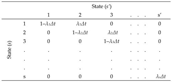 Then, the transition intensity (λ) was calculated by sequentially differentiating Kolmogorov’s forward equations for a pure birth process. The equation was solved for a very small time interval (∆t), where a maximum of one state transition can occur. For a pure birth process, the initial transition matrix is defined as the product of transition intensity and time interval (i.e., λs∆t), as shown in Figure 1. This is a square matrix (s (current state) by s′ (succeeding state) where s = s′). An n-step transition matrix (based on the initial transition) determines the transition probability for any inspection time interval t.