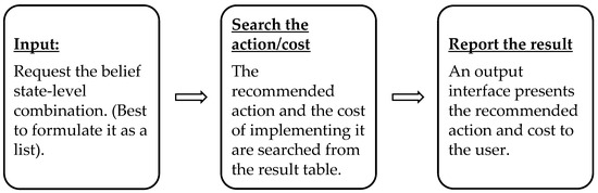 For both observation matrix formulations, the solver reported a do-nothing action for state 1, the application of inhibitors for states 2 and 3, pigging for states 3 through 6, and replacement for states 7 and 8 when the POMDP model considered all states that can be fully observed. In other words, this result is what would be attained when the model is formulated as an MDP (i.e., the states are fully observable). The main objective of this modeling was to obtain a recommendation for optimal maintenance operations for different belief states of pipeline deterioration. Accordingly, the result of the model consisted of recommendations for 19,448 belief states combinations. These are obtained from the ten belief states (for each of the eight states) that add up to 1. The optimal action and its cost were given for these belief states. A user interface will be required to read the maintenance action for the specific belief states′ combination since the reported combination of belief states is large. Figure 2 gives the general framework of this interface. Do-nothing was recommended at 80.5% (15,662 combinations) and 72% (13,996 combinations) for overlapping and no-overlapping models, respectively. Inhibitors, pigging, and replacement were reported at 1.2% and 1.4%, 3.3% and 3.8%, and 15% and 22.9%, respectively, for the two models.