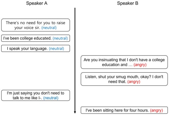 An example of self-dependency context. As shown in the figure, each speaker maintains a consistent emotional state regardless of the counterpart speaker’s emotional state or utterance.