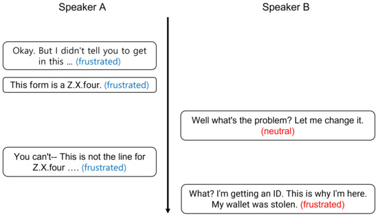 An example of inter-speaker dependency context. As shown in the figure, Speaker B’s emotional state shift from neutral to frustrated is triggered by Speaker A’s response.