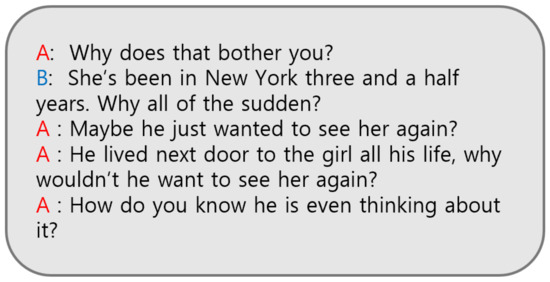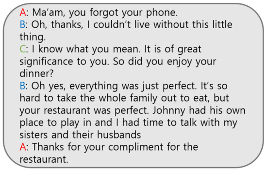 Conversations can be classified according to the number of speakers: a dyadic conversation, which is a conversation between two people (Figure 3 and Figure 4), and a multi-party conversation, which is a conversation between more than three speakers (Figure 5). In the real world, there is no limit to the number of speakers during conversations. The greater the number of speakers in a conversation, the more difficult it could be for the model to capture speaker-dependent contexts.