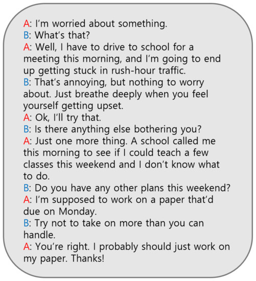 - Li, Y.; Su, H.; Shen, X.; Li, W.; Cao, Z.; Niu, S. Dailydialog: A manually labelled multi-turn dialogue dataset. arXiv 2017, arXiv:1710.03957. [Google Scholar]