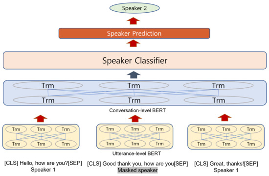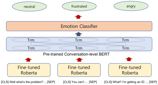 Due to the remarkable improvement in pre-training language models in a variety of NLP tasks [7,8,9,10], there have been attempts to use a pre-training model for ERC tasks. Hazarika et al. [11] suggested that generative conversational models can be leveraged to transfer knowledge for the ERC task, while Jiao et al. [12] suggested the ConvCom (Conversation Completion) task as an effective pre-training method for the ERC task.