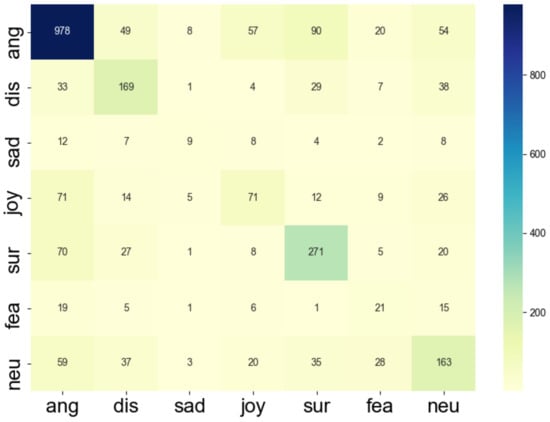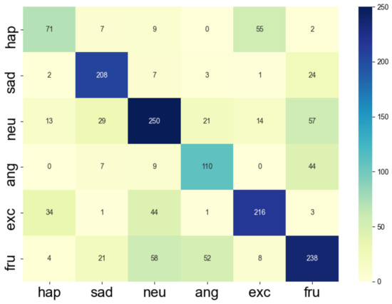 With the IEMOCAP dataset, there are some misclassifications among similar emotions such as happy–excited, frustrated–angry and frustrated–sad. Our model is confused especially among sad, angry, and frustrated, which is consistent with the results shown in Table 4.