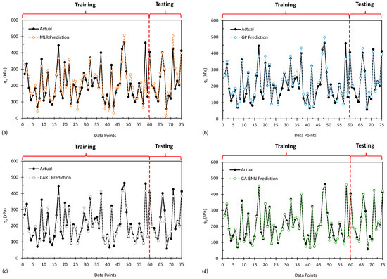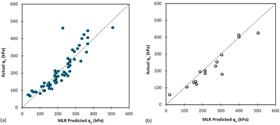 The findings from Table 4 indicate that the MLR model is unlikely to yield strong predictions for the output parameter. However, the MLR model was thoroughly examined, and the best performing model was selected. Figure 5 illustrates the comparison between the predicted and actual values generated by the numerical model. Despite the efforts, the MLR model did not accurately predict the parameter qu, lacking sufficient precision in its predictions.