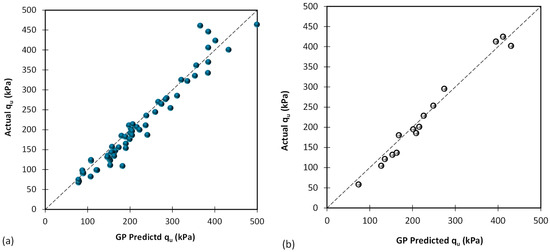 Upon applying Multiple Linear Regression (MLR) as the statistical model, a grey box AI model called Genetic Programming (GP) was utilized to forecast the bearing capacity of shallow foundations (qu). Through a thorough analysis of various GP models, the most optimal model was identified. As depicted in Figure 6, the outcomes of the best GP model show a favorable alignment between actual and predicted values. These results demonstrate the remarkable accuracy of the GP model in forecasting qu (bearing capacity) values.