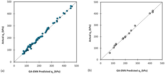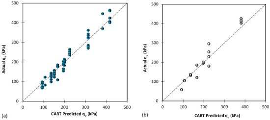 After utilizing GP as a grey box AI model for predicting the bearing capacity of shallow foundations, this discussion was further extended to include another grey box AI model, namely Classification and Regression Trees (CART), to complete this group of grey box models. Following a comprehensive evaluation of multiple CART models, the most optimal model was identified. Figure 7 illustrates the results obtained from the best CART model, showcasing a remarkable agreement between the actual and predicted values. These findings highlight the CART model’s exceptional accuracy and precision in forecasting bearing capacity of shallow foundations (qu) values. The incorporation of both GP and CART models provides valuable insights into the predictive capabilities of grey box AI techniques for estimating bearing capacity, enabling more reliable and informed decision making in foundation engineering applications.