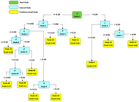 The output of the CART model is presented as a decision tree, which effectively captures and represents the data intervals described in Figure 8. This decision tree serves as a graphical representation of the model’s decision-making process. It illustrates a sequence of decisions made by the model to ultimately arrive at its prediction.