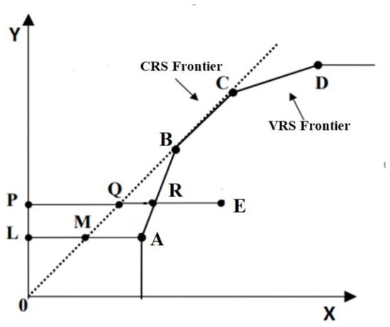 The CCR model was based on the Farrell method of measuring the efficiency of the units studied using production functions [34]. The equation with a nonlinear Farrell program displays a simple production ratio with a single input and output parameter [12,13,14]. In this model, multiple input and output parameters of each enterprise are combined into various scalar input and output parameters. This model is based on a constant return to scale (CRS).