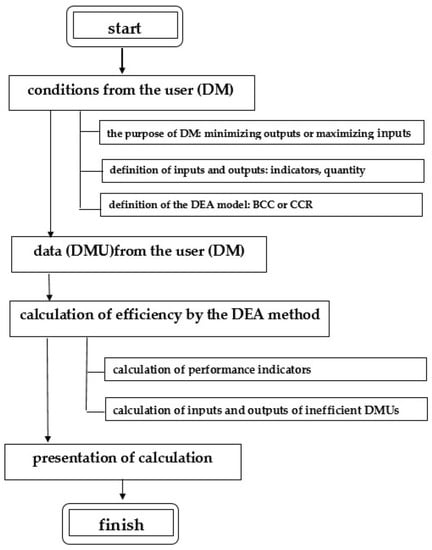 Farrell [54] was the first to propose measuring the efficiency of a complex system based on one input and one output indicator. In 1957, the author applied this model to the elements of the United States agricultural system, failing, however, to combine all the possible input and output indicators to calculate the effectiveness of the elements studied. This methodology was developed by Charnes, Cooper, and Rhodes in 1978 [55]. They suggested using mathematical programming to solve this kind of problem. The DEA method was then formulated. Over the years, the method has been widely applied in various fields to calculate both the technical and economic efficiency of the functioning of enterprises as complex systems [56,57,58,59].
