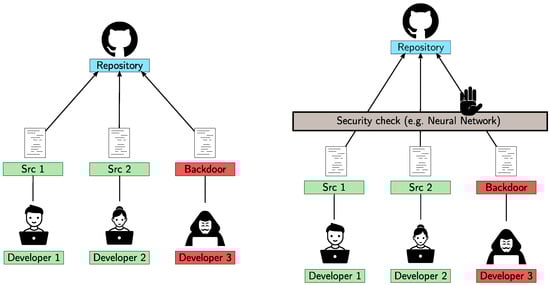 This study proposes to assess the robustness of a classification system by producing, with evolutionary techniques, program instances that mislead a system trained in the detection of software vulnerabilities. In other words, the goal is to synthesize vulnerable programs that will be classified as safe by the system, or vice versa. A possible application scenario is shown in Figure 1, in which many developers make commits in a shared repository and one of them is malicious and wants to insert a backdoor. In an unsafe setting (left), the backdoor can be easily placed. In the setting reported in the right image, instead, a security check is installed, and the malicious code should be blocked. The goal of the attacker is thus to deceive the check and to push malicious code that is not detected. Given the described context, we define the following threat model, which is compliant with the approach presented by Papernot et al. []: