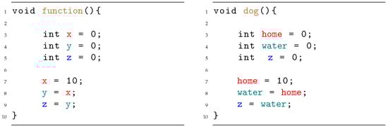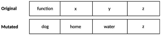 The mutation operator consists of modifying the identifiers within the source code of the functions so that, in each function F, each occurrence of the identifier IDi is consistently replaced with the same new identifier ID. To this end, two different vocabularies of words are used, and the algorithm can generate new variable names during the mutation process by selecting words from these vocabularies. They are meant to follow two different policies: