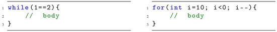 Dead code examples. Both the bodies inside the while (left) and for blocks (right) cannot be executed, since the conditions are never satisfied.