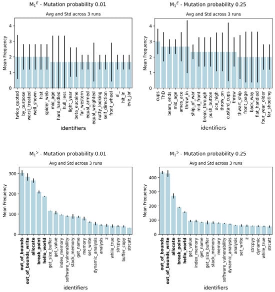 For , this simple experiment shows how easy the possibility of misleading the neural network is even with a restricted set of words, thereby highlighting the model’s high sensitivity to even minor variations. The results demonstrate no substantial variations across the three runs for each mutation probability. In particular, the words out_of_bounds and out_of_bound_write always have the highest frequencies, together with three other words highlighted in bold in the figure.