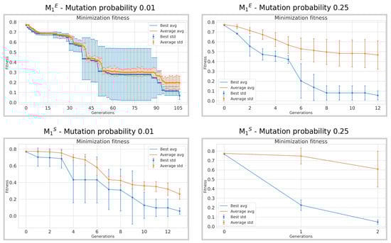 The ES algorithm is applied by using two different mutation operators, and , which will be defined in Section 4.2, and four different mutation probabilities, namely, , , , and . These mutation probabilities determine the probability of introducing changes in the individuals during each iteration of the ES algorithm, as detailed in Algorithm 2. Each experiment is repeated three times to guarantee the consistency of the data between runs. A total of 200 generations is chosen as the number of iterations for the ES algorithm relative to , and 100 for . Specifically, there is a disparity in the number of generations between and . In the case of , employing 200 generations would lead to high computational time. Additionally, the set to be explored in is not extensive. This selection guarantees a sufficiently broad range of iterations to adapt to the smallest mutation probability of 0.01 and allows it to eventually converge on the chosen threshold of .