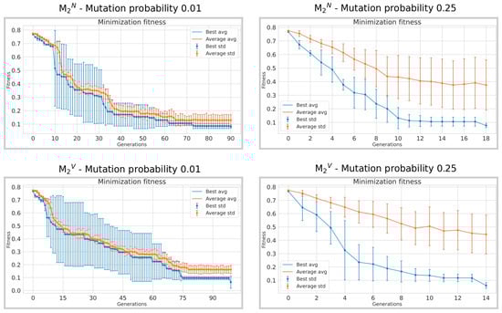 Average fitness obtained across 3 runs for the lowest 0.01 and the highest 0.25 mutation probabilities of the experiments. Vertical bars represent the standard deviation, the orange curves represent the average fitness of the population at each generation, and the blue curves represent the fitness of the best individual at each generation. The x-axis is truncated at the point where the algorithm achieves convergence.