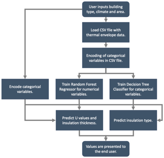 Therefore, as depicted in Figure 1, the basic working framework is that the RS takes in information related to the building area, the climate zone in which the building is located, and the building type. Based on this, employing a hybrid-model-based approach, it makes predictions related to the characteristics of the thermal envelope of the building (specifically U values of the walls, roof, windows, type of insulation to use for walls/roof, and thickness for this insulation). These suggestions (wall, roof, and window U values) can help in optimizing Key Performance Indicators (KPIs) such as energy consumption for heating and cooling, indoor temperature stability, and environmental sustainability while also giving some important parameters to building designers aiding in the designing process. Knowing optimal U values and using the right insulation material will help prevent overheating by reducing solar heat gain. The designer can derive benefits from these suggestions during the design phase. The data collection, pre-processing, and algorithm selection details are discussed in the following subsections.