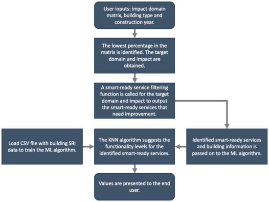 The main concept for the SRI-based algorithm for RS is depicted in Figure 3. The RS takes the impact-domain matrix from the SRI assessment along with some building information like building type and year of construction. The reason for using the impact-domain matrix from the SRI information is that it tells us about the area in the systems of the buildings that needs the most improvement. The lowest percentage in the impact-domain matrix is identified, and then the services contributing to this low percentage are listed.