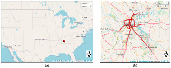 The radar detector system (RDS) in Nashville consists of 349 detectors covering 564 directional links. The geographic locations of the detectors used in this study and the shape of input data matrix are displayed in Figure 1. Figure 1a displays where Nashville, TN, is in the US, and Figure 1b shows the location of all detectors in Nashville, TN.