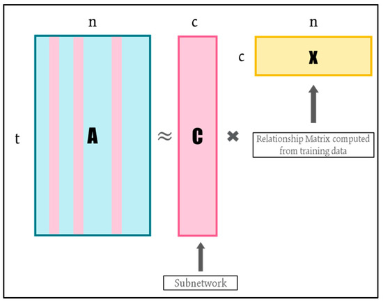 - is the relationship matrix which projects the selected columns back onto all the columns in original data space [21]. For the given matrices and , the relationship matrix is computed as the matrix product of and .