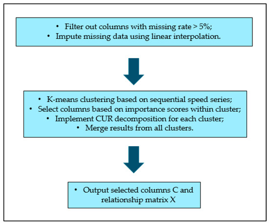 Stocks from different sectors will go through a rigorous screening process and then be selected to represent the whole market using a weighted average index. Similarly, to select most representative traffic detectors in a massive road network, the first step is to filter out columns with missing rate greater than 5% and to impute the remaining columns using data from adjacent time intervals (linear interpolation). Then, we can classify the detectors into different clusters based on their speed during the training period, followed by the normal CUR decomposition process within each individual cluster given a fixed compression rate (CR). Finally, the selected columns and corresponding relationship matrix will be merged as the final CUR outputs. The entire column selection process is displayed in Figure 4.