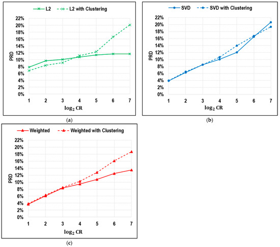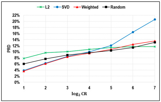 Figure 5 shows the performance of the proposed weighted method compared with the L2 norm, SVD-based leverage, and random sampling methods. The red line in the graph indicates that the weighted method outperforms all other three options when the compression rate (CR) is lesser than 32 (). The proposed weighted method resulted in lower PRD than other methods when the CR does not exceed 32, whereas the drawback of the weighted sampling method is relatively longer computational time. When the CR surpasses 32, the proposed weighted method is only better than the SVD-based leverage method, partly because the presetting default value of the weight (w) is 0.5, which provides too much weight for SVD-based leverage. Random sampling is even better than the L2 norm option when the CR is less than 64, which might be due to randomness and fluctuation. It is worth noting that SVD-based leverage and proposed weighted sampling perform best with a CR less than 8, whereas the error for the SVD-based leverage option increases dramatically as the CR becomes greater than 32.