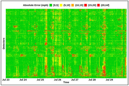 Taking CR = 16 with the proposed weighted average method as an example, Figure 6 depicts the absolute error of the original matrix and inferred matrix for the testing period (23 July 2023, to 29 July 2023). The horizontal axis represents the dates and the vertical axis is the detectors. There are 31 links selected, and the PRD = 9.5%. The absolute error is less than 10 mph for 94% of time and detectors. Some recurring patterns can be found, probably due to the recurring peak-hour congestion at some detector links.