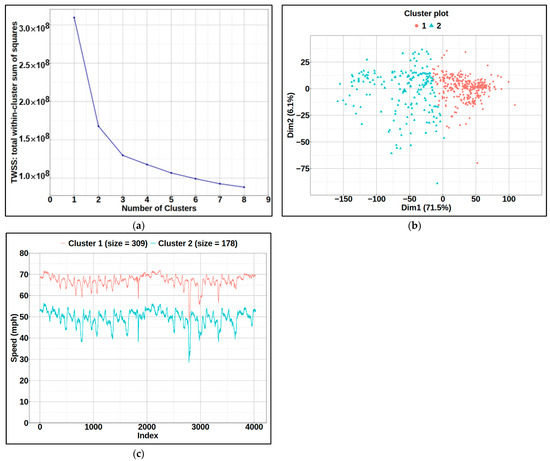 Firstly, K-means clustering was implemented on the original data to classify detector links into different groups based on their speed measurements during the training period. Figure 7a shows the results of the elbow method which implied that two is more likely to be the optimal number of clusters, and Figure 7b displays the cluster results for all observations projected onto the dimension of two principal components. As can be seen, there are overlaps between the two clusters. Figure 7c displays the centroids of two clusters, respectively. The red line is the center of the first cluster, with speed around 70 mph, and the speed of the second cluster’s centroids, shown in blue, fluctuates around 50 mph.
