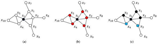 We take cluster one as an example. The shelved–retrieved method randomly selects a point from the dataset to serve as the initial site for cluster one. This selected point is assigned to cluster one and colored black in Figure 1a. Further, the adjacent hollow points of black points , are identified and colored red in Figure 1b. According to parameters , the shelved–retrieved method estimates whether is smaller than at each point . Assuming that are the smallest and are not, the shelved–retrieved method assigns points to cluster one, and we color them black in Figure 1c. Points and are colored blue. The shelved–retrieved method repeats the aforementioned operations until no additional adjacent hollow points are identified.