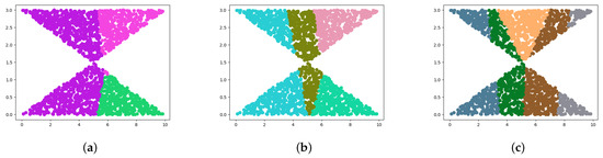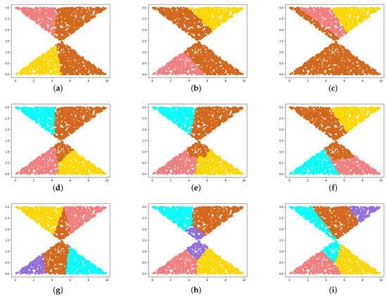 For all synthetic cases, 2000 points were generated in a funnel-shaped region, and chosen to effectively represent concave conditions. Three separate cases were constructed to evaluate the effectiveness of the proposed method on datasets containing different numbers of clusters. In Case 1, three subarea capacity intervals were set as [1969.49, 2089.49], [5819.85, 5939.85], and [2182.77, 2302.77]. In Case 2, we increased the number of subareas and the capacity intervals were set as [1969.49, 2089.49], [3819.85, 3939.85], [2182.77, 2302.77], and [1819.85, 2039.85]. In Case 3, we set five subareas with capacity intervals [1969.49, 2089.49], [2819.85, 2939.85], [2182.77, 2302.77], [1819.85, 2039.85], [819.85, 1045.85].