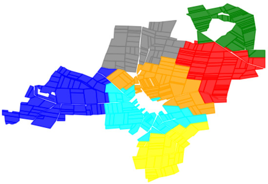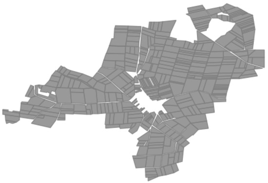A total of 399 lots in Figure 4 are cultivated by seven farmers, and each farmer requires that the area should not change too much after reassignment. Each farmer, respectively, provides the lower and upper thresholds , i.e., the maximal value of area deviation. The original farm area of farmer i is denoted as ; then, the restructured farmland area is within the interval . To harmonize expressions of formulation, we denote and .