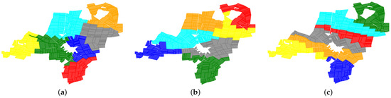 Furthermore, the shelved–retrieved method is applied to solve the farmland consolidation with in the experiments. Three cost kernels are used to measure different transportation costs in farmland consolidation. The results corresponding to the three distinct objective functions are shown in Figure 6. Compared with the result of the D-CPD method in Figure 5, the shelved–retrieved method produces connected results but the D-CPD method does not. Thus, the shelved–retrieved method can reasonably solve the WBCC problem in farmland consolidation.