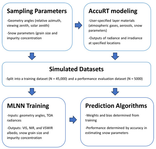 Light from the sun will be absorbed and scattered in predictable ways depending on the snow’s physical and optical properties. Remote sensing instruments deployed on satellites can collect reflected radiances at the top of the atmosphere. These TOA radiances depend on snow properties as well as the sun-satellite geometry, i.e., the solar zenith angle, the sensor polar viewing angle, and the relative azimuth angle. A radiative transfer tool can be used to model these TOA radiances as a function of wavelength. A flowchart summarizing the methods used in data formation, modeling, and algorithm formation is shown in Figure 1.