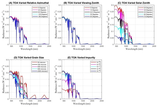 Radiance vs. wavelength plots at TOA, the black lines in all plots have constant relative azimuthal angle of 90, viewing zenith angle of 22.5, solar zenith angle of 45, grain size of 300 µm, and impurity concentration of . In all plots, four of the parameters are held to the constant values listed above, while the fifth is varied. (A) Varied relative azimuthal angles from 0 to 180. (B) Varied viewing zenith angles from 0 to 45. (C) Varied solar zenith angles from 20 to 75. (D) Varied snow grain size from 50 to 2500 µm. (E) Varied impurity concentration from to .