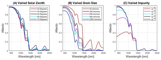 Albedo vs. wavelength plots for a variety of conditions. The black lines in all plots have constant relative azimuthal angle of 90, viewing zenith angle of 22.5, solar zenith angle of 45, grain size of 300 µm, and impurity concentration of . In all plots, four of the parameters are held to the constant values listed above, while the fifth is varied. (A) Varied solar zenith angles from 20 to 75. (B) Varied snow grain size from 50 to 2500 µm. (C) Varied impurity concentration from to .