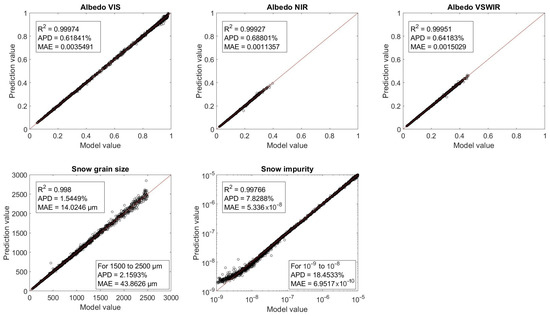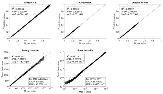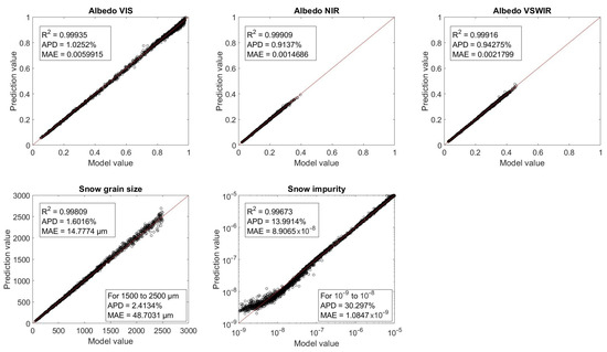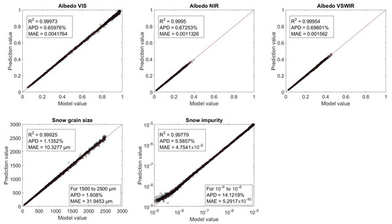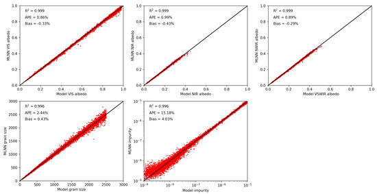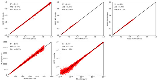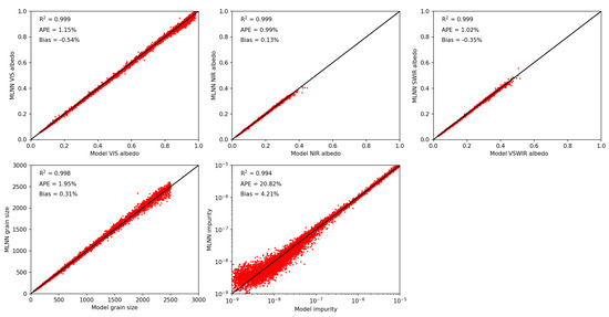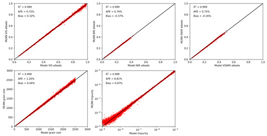 From the 50,000 values in the synthetic snow dataset, 45,000 were used for MLNN training while the other 5000 were used for performance evaluation. Snow parameter retrieval MLNN training completed with an average score across all parameters of 0.997 and a minimum band score of 0.992. The snow impurity parameter had the largest average percent error (APE) and bias of all the retrieval parameters. Training for albedo parameters and snow grain size performed well with all four MLNNs producing high scores (0.996 on average) and low APEs and bias. A different configuration of neurons in the hidden layers might have yielded better results, but the average scores already indicated that we had obtained an acceptable fit. MLNN training performance versus model synthetic data are shown in Figure 4, Figure 5, Figure 6 and Figure 7 for the SBG, MODIS, SGLI, and Max-Min MLNNs.