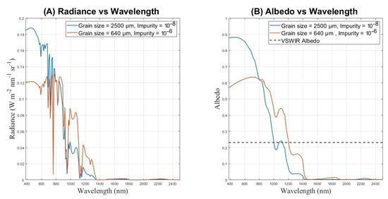 Radiance vs. wavelength (A) and albedo vs. wavelength (B) for two simulated samples, both with the same relative azimuthal angle of 90, viewing zenith angle of 22.5, and solar zenith angle of 45. The blue line has grain size of 2500 µm and impurity concentration of , while the red line has grain size of 640 µm, and impurity concentration of . Both samples have the same VSWIR (380–2500 nm) albedo of 0.231, shown by the dashed black line.