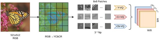 Lossy image compression is a fundamental branch of image processing that addresses the problem of reducing the data required to represent an image by selectively discarding the information that is deemed less relevant for the human perception. Typical lossy compression algorithms encode images in ways that exploit the inherent redundancy, allowing them to be efficiently represented using fewer bits. The first aspect to consider when designing a compression algorithm that can be leveraged for latent-space image synthesis is the convolutional encoder–decoder style of the generative model itself, which can only produce output of fixed size. Conversely, the most popular image compression algorithms, with JPEG on top of all, produce variable-length compressed representations for different images. For this reason, we devise a simple yet effective compression strategy based on VQ techniques, which maintains a constant compressed representation size for each patch by employing predefined codebook mapping input vectors to fixed-length code words, thus ensuring consistent compression regardless of image content. Similar strategies have been popular since the 1980s (see e.g., [13,14]) for their simplicity and overall good performances. In the deep learning era, VQ-like approaches were rediscovered [12], as was the case with other compression techniques [15,16].