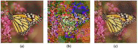 This approach has been shown to be valid in the case of a latent space defined by a deep autoencoder [6,12]. However, when relying on the shallow latent space defined by the proposed compression algorithm, we observed the impossibility of learning anything useful. The causes of this limitation can be traced back to the definition of the encoding algorithm using VQ (and its other embodiments), especially in the definition of the codewords using k-means, as defined in Equation (10). Effectively, the encoding of an image patch with the assigned code imposes a bi-univocal correspondence with the set of positive integers, which implies an inherent total ordering of the codewords . The imposed ordering, which by the nature of k-means is fundamentally random, is not reflected in an ordering of the space where codewords are defined; hence, the addition of Gaussian noise to i will result in the random assignment of a new codeword , while ideally the additive noise should lead to a codeword . The above can be intuitively appreciated by observing the effect of a constant addition on an encoded image in Figure 3b.