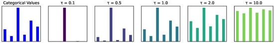 The effect of the introduction of can be qualitatively appreciated in Figure 9. In particular, for , the sampling operation corresponds to the function and essentially defines the mode of the categorical distribution, while for larger values of , the distribution shifts towards a uniform distribution.