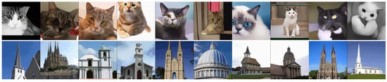 We assess the generative performances in a single-class unconditional scenario on two subsets of the LSUN dataset [34] which are extremely popular in this context: the cat subset and the church one. The first is a large dataset of over 1.6 million images of cats acquired from a wide variety of sources. This is a very complicated dataset due to the extreme variability in the appearance and composition of the images, caused in part by the nature of the subject. In contrast, the dataset of churches is smaller with only 125 thousand images, and it is considerably easier to handle because of the chromatic and geometric regularity of the buildings represented. All the experiments are conducted with an image resolution before compression of , which means a latent representation of using the OPQ-{32-8-8} encoding.