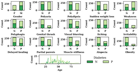 Figure 3 depicts the results of exploratory data analysis of the diabetes dataset for all the features. In Figure 3, N refers to the negative, whereas P refers to the positive. In addition to that F, and M refer to females and males, respectively. According to Figure 3, females are more affected by diabetes compared to males. The figure also shows that patients with polyuria, polydipsia, or sudden weight loss are more likely to have diabetes. Of the patients who do not have polyuria, polydipsia, and sudden weight loss, around 70% do not have diabetes. For polyphagia, irritability, partial paresis, and obesity syndromes, patients have a high diabetes risk. Among those who do not have polyphagia, irritability, partial paresis, or obesity, about half have diabetes. According to Figure 3, patients who are more than 30 years old are highly vulnerable to diabetes.