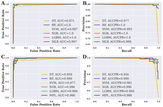 Figure 4 shows the ROC curve and precision–recall (PR) curve for six different ML techniques that have been applied in this study. The results for the balanced dataset are shown in Figure 4A,B. On the other hand, Figure 4C,D show the results of the imbalanced dataset. For a balanced dataset, the highest AUC score is 1.00 for RF, XGBoost, and LGBM, as shown in the figure. At the same time, RF, XGBoost, and LGBM show the highest AUCPR value, which is also 1.00. On the contrary, the maximum AUC score is 0.999, as shown by RF. It is worth noting that RF also shows the highest AUCPR value of 0.999 for an imbalanced dataset.