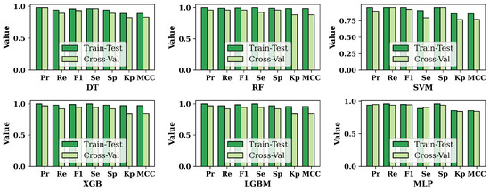 The results of the performance metrics for six ML approaches are shown in Figure 5. In Figure 5, we compare the results of train–test split and cross-validation techniques for the balanced dataset. It is shown that the results of train–test-split are mostly higher than those of cross-validation. But in a few cases, the results of cross-validation are increasing. For DT, precision and sensitivity show the same results for both train–test split and cross-validation. SVM yields the same recall and specificity results for both techniques. Furthermore, the MLP shows few exceptions; in the MLP, the results of precision and sensitivity for cross-validation are higher than the train–test split’s result.